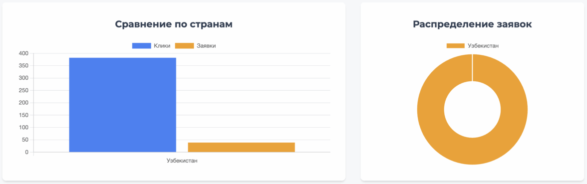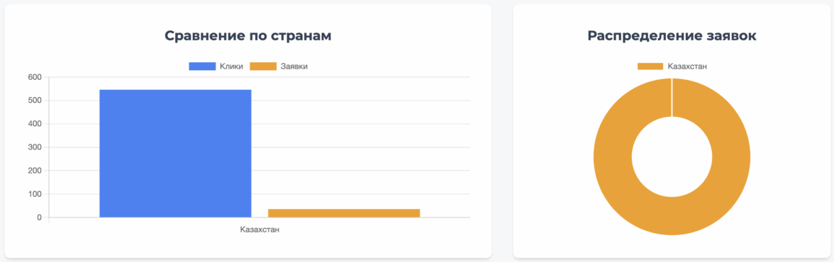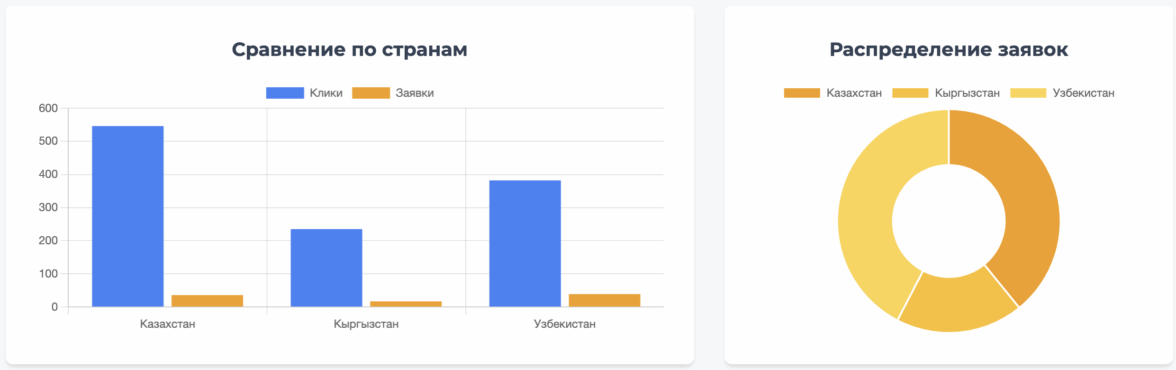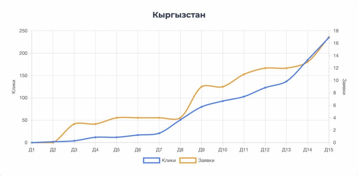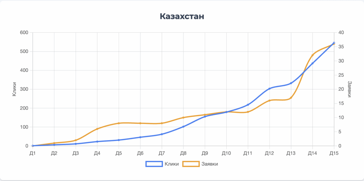 Наибольшее количество кликов было получено из Казахстана, что соответствует самому большому выделенному бюджету. Однако Узбекистан показал себя как источник наиболее конвертируемого трафика, обеспечив 42% всех заявок. Это говорит о высокой заинтересованности и релевантности аудитории в данном регионе.