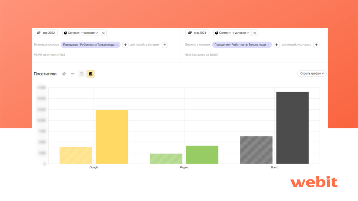 Суммарный поисковый трафик в январе 2024 к апрелю 2022 году вырос более, чем в два раза. Рост трафика наблюдается как в Яндекс, так и в Google.