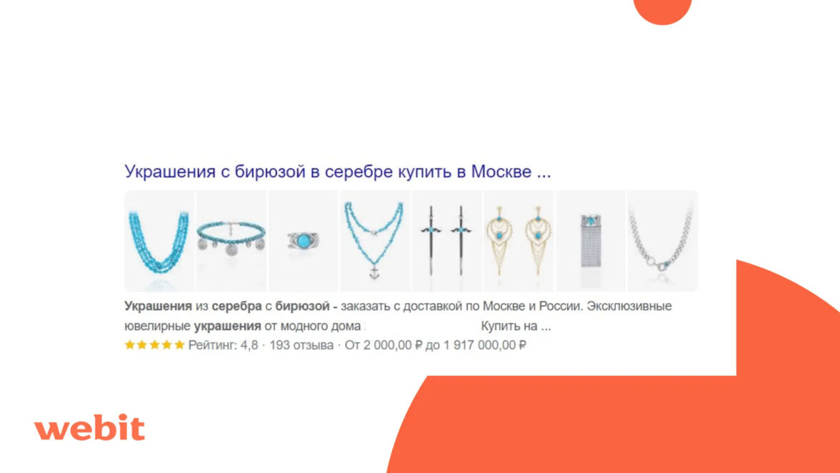 В поисковой системе Google мы настроили несколько видов микроразметок, с помощью которых в сниппет подтягиваются: карусель картинок, количество отзывов, рейтинг и цена товаров.