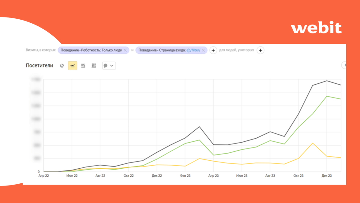 Функционал умного фильтра был доработан — так мы исключили возможность генерации дублей страниц через фильтр, задали статичные ЧПУ, внедрили уникальные шаблоны заголовков h1, мета-тегов и хлебных крошек с переменными. Страницы с одним параметром в url-адресе были открыты для поисковых систем сразу. Это позволило создать большое количество новых посадочных страниц, максимально охватить интересующие нас СЧ и НЧ запросы и привести дополнительный трафик на сайт. До июня 2022 переходов по данному типу страниц, как видно из графика ниже, не было.