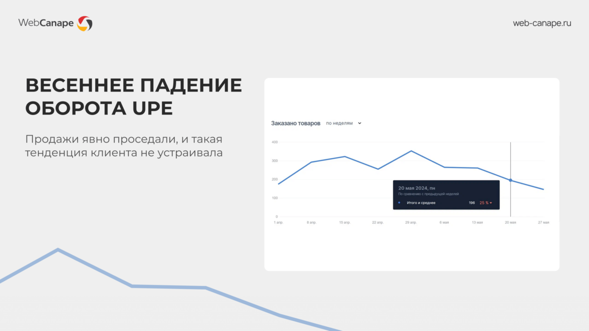 В ситуации с UPE мы обнаружили, что SEO-продвижение работало на довольно высоком уровне, ключевые запросы присутствовали в описаниях, фотоконтент притягивал взгляд. Но несмотря на это продажи явно проседали, и такая тенденция клиента не устраивала.