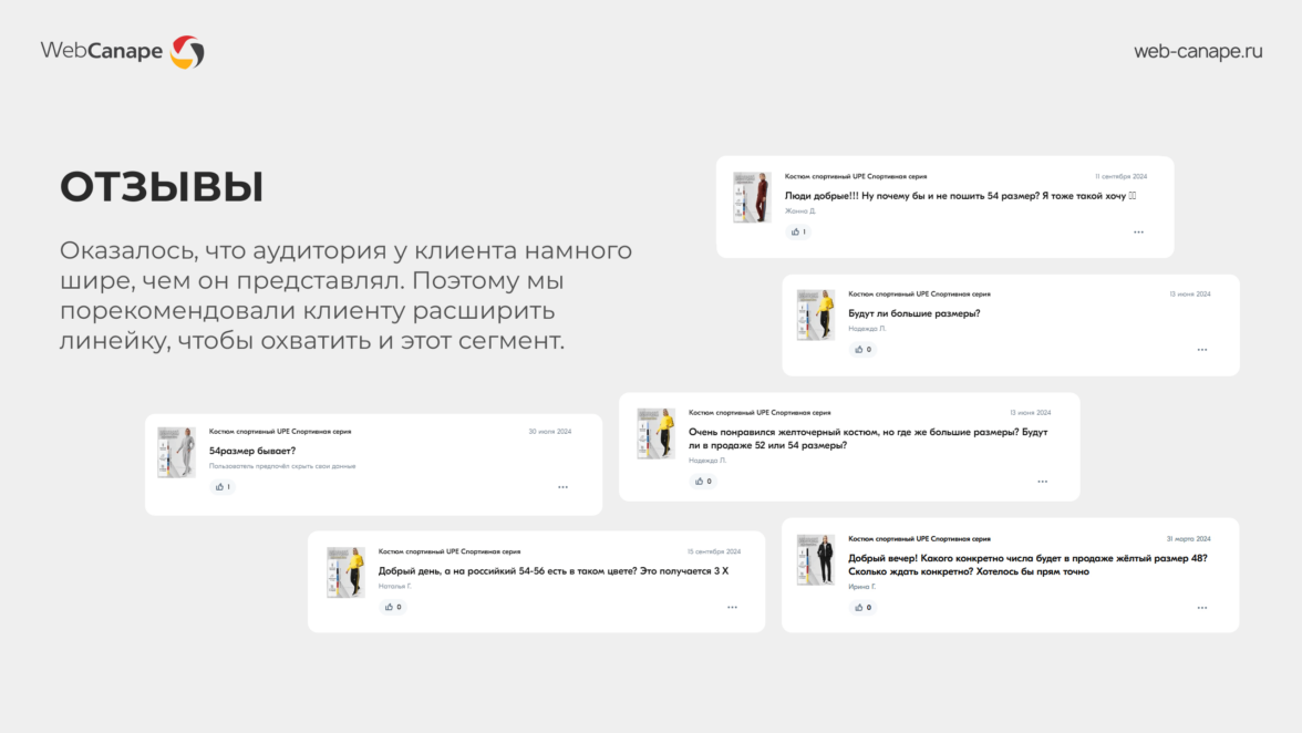 Оказалось, что аудитория у клиента намного шире, чем он представлял. Бренд ориентировался на покупателей с размерами 44–52, но востребованными были и модели большего размера. Поэтому мы порекомендовали клиенту расширить линейку, чтобы И уже скоро костюмы новых размеров появятся на витринах маркетплейсов.
