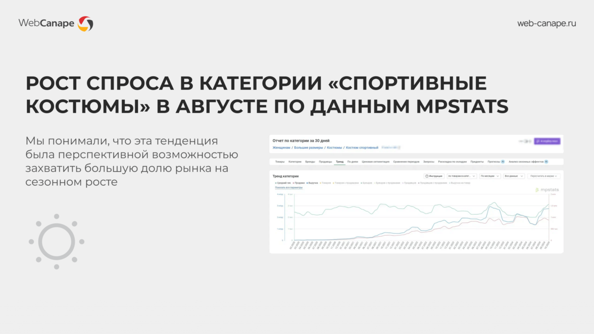 С чем же связана такая просадка? Аудит ниши показал, что в эти месяцы обороты падали у всех селлеров в товарной категории клиента. Но мы понимали, что этот спад был и перспективной возможностью захватить большую долю рынка на сезонном росте: