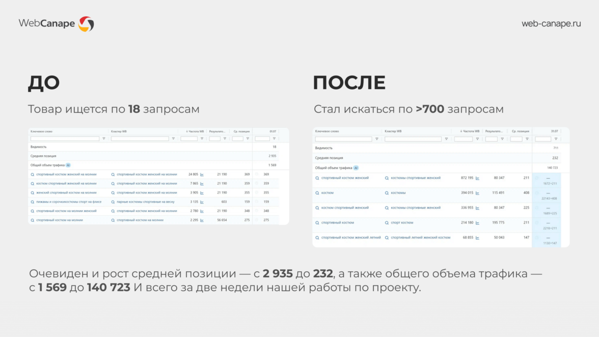 Очевиден и рост средней позиции — с 2 935 до 375, а также общего объема трафика — с 1 569 до 140 723. И всего за две недели нашей работы по проекту.