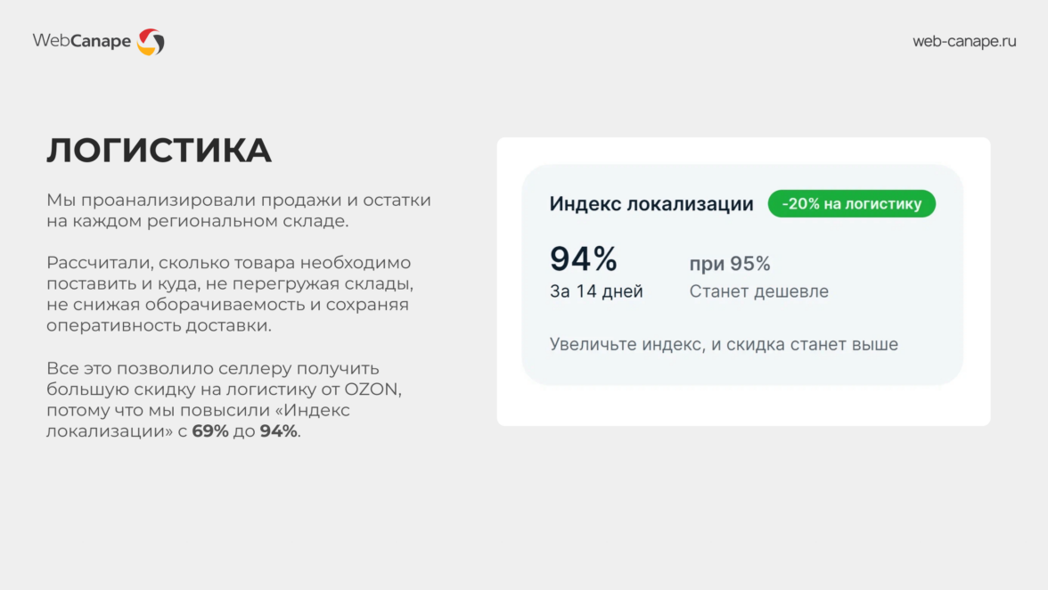 Все это позволило селлеру получить большую скидку на логистику от OZON, потому что мы повысили «Индекс локализации» с 69% до 91%.
