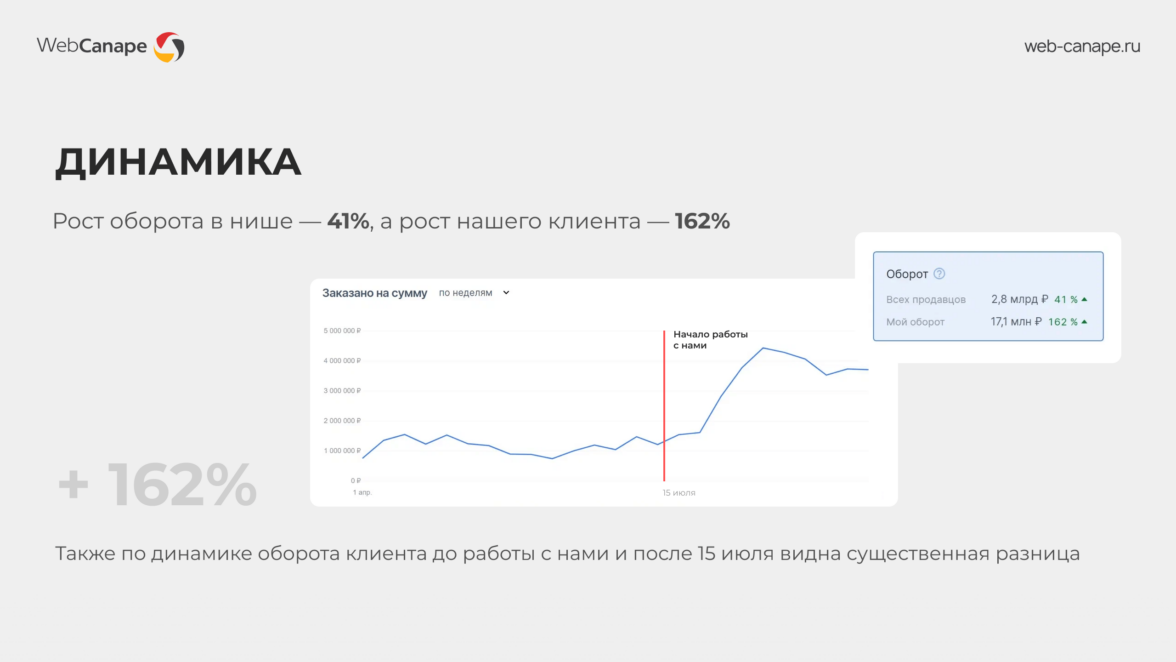 Динамика оборота клиента до работы с нами и после 15 июля. Рост нашего клиента — 162%