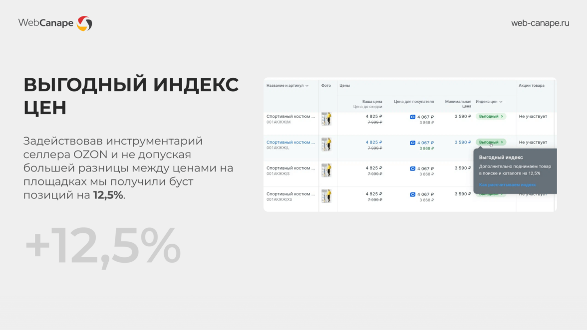 На OZON можно получить дополнительный рост позиций по показателю «Индекс цен». Если цены на товары селлера на WB не отличаются от цен на OZON более, чем на 1%, то МП поощряет продавца. Мы не допускали большей разницы, поэтому получили буст позиций на 12,5%.