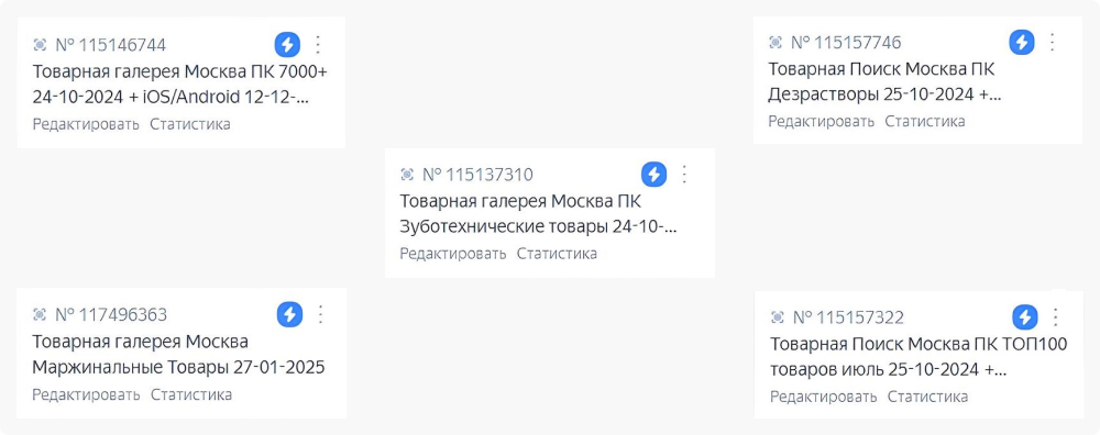 Сперва мы начали именно с основных категорий сайта и под каждую из них завели отдельную кампанию. Основная цель — максимизация товарных предложений в выдаче, так мы могли использовать форматы товарных кампаний в галерее, на поиске и затем уже добавили смарт-баннеры для тех, кто интересовался аналогичными товарами на сайте или у конкурентов.