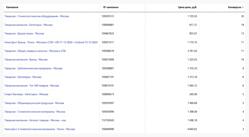 Затем выделили из текущих кампаний товарные группы, которые приносят заказы, с целью увеличить вложения именно по конверсионным направлениям. Помимо этого собрали самые продаваемые артикулы за определенный промежуток времени, так как одна из гипотез, что люди заходят по одним из этих товаров и формируют на основе одного из них всю свою корзину.
