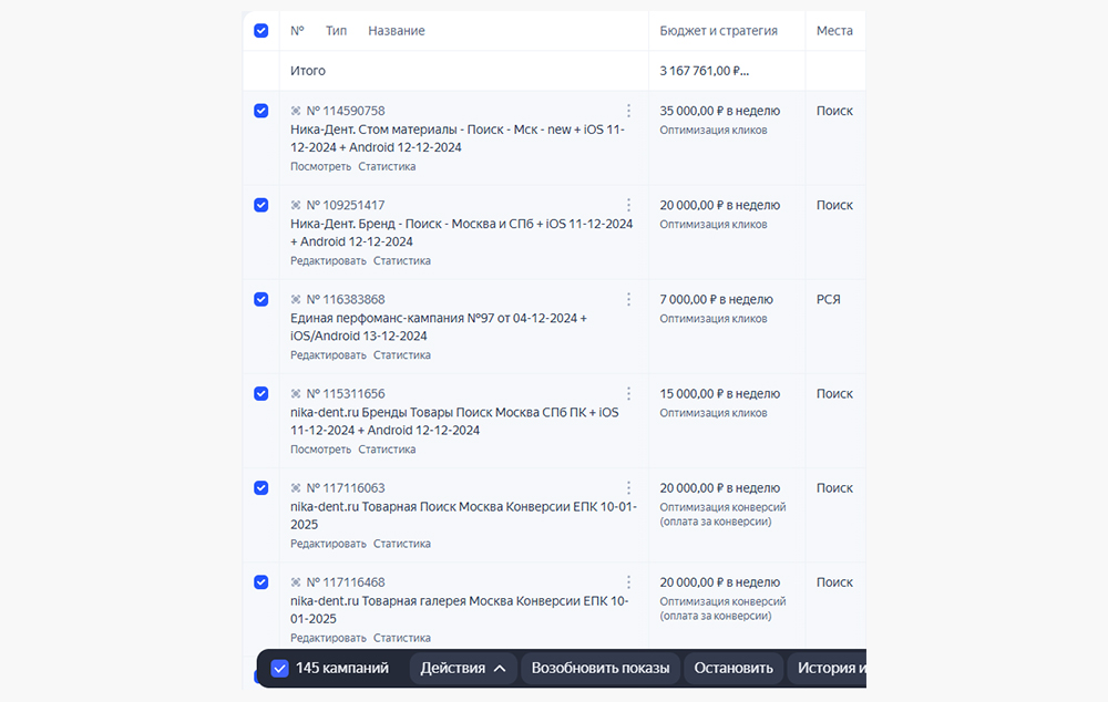 Всего за период работы и корректировок было создано 145 рекламных кампаний: