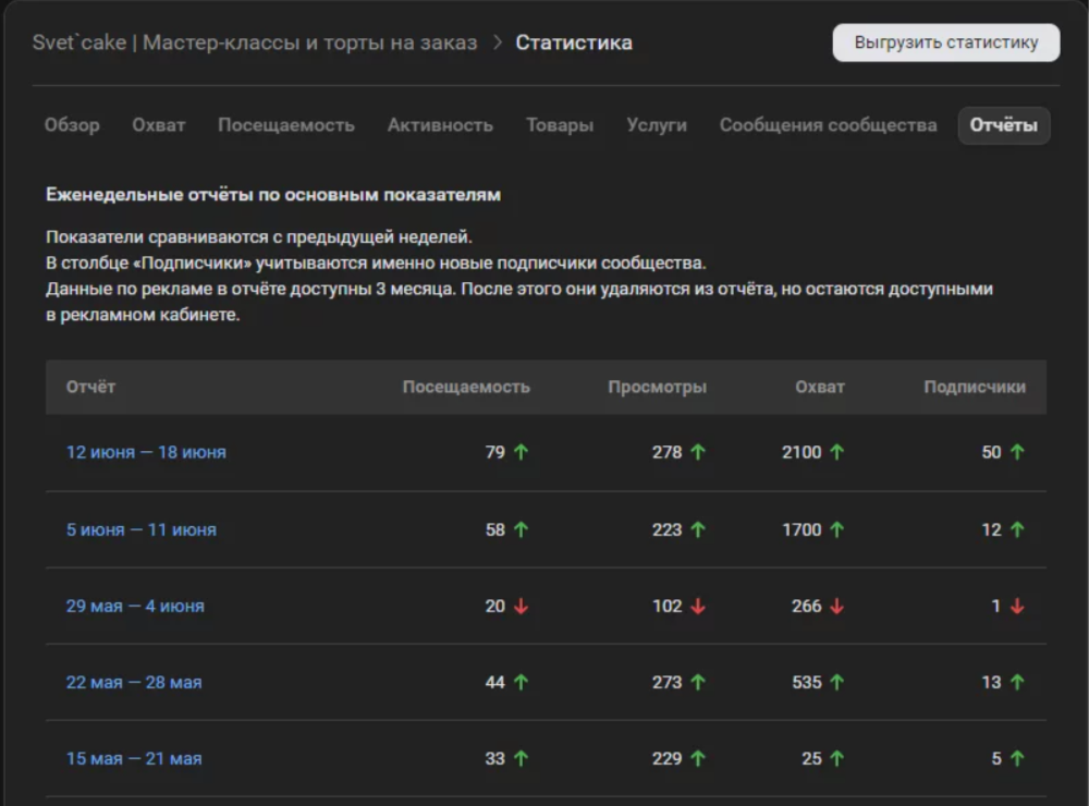 Рекомендации:- запустить таргетированную рекламу для дальнейшего прироста лидов у кондитера.- создать автоматическую онлайн-форму для заказов тортов и записи на мастер-классы в ВКонтакте.- придерживаться в фотоконтенте единой визуальной линии (использовать одинаковые фильтры и обработку).