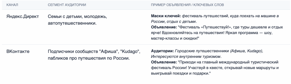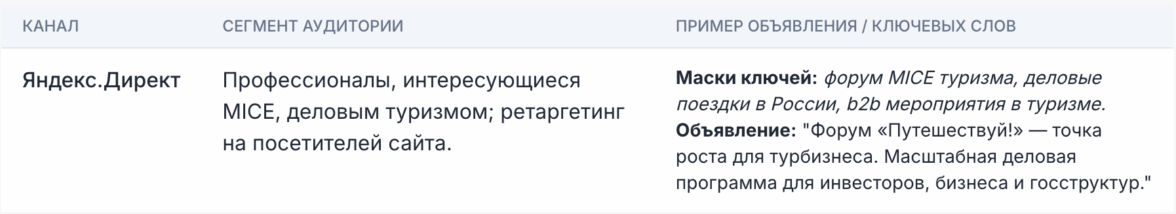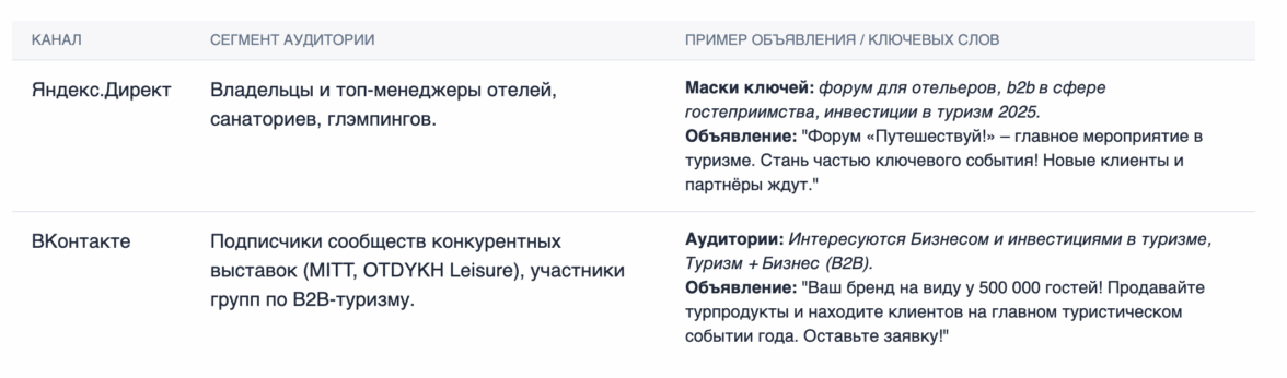 В основе нашей стратегии лежал матричный подход. Для каждой из трех ключевых задач (привлечение экспонентов, регистрация на деловую программу, привлечение B2C-посетителей) мы разработали отдельную матрицу. Она связывала воедино **сегмент аудитории, рекламный канал, ключевой оффер и посадочную страницу**. Такой подход позволил максимально персонализировать коммуникацию и повысить релевантность рекламы.