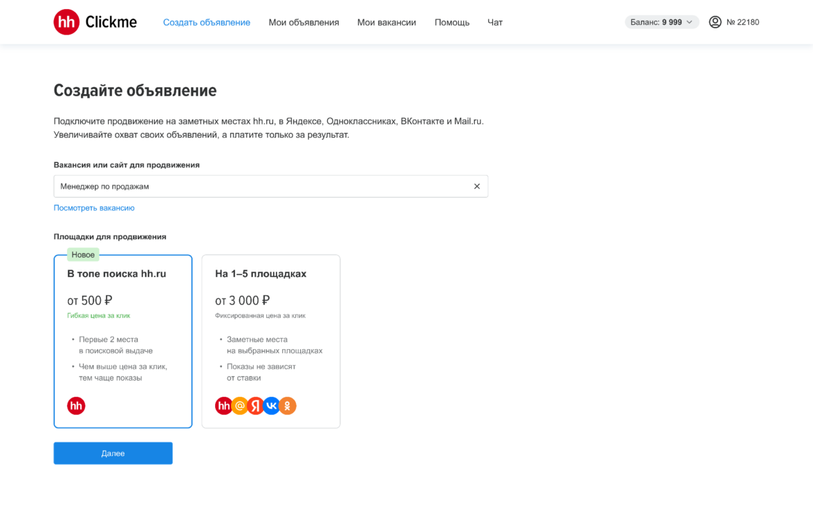 В личном кабинете Clickme: создайте объявление, добавьте ссылку на вакансию. При выборе «Площадок для продвижения» укажите «В топе поиска hh.ru»: