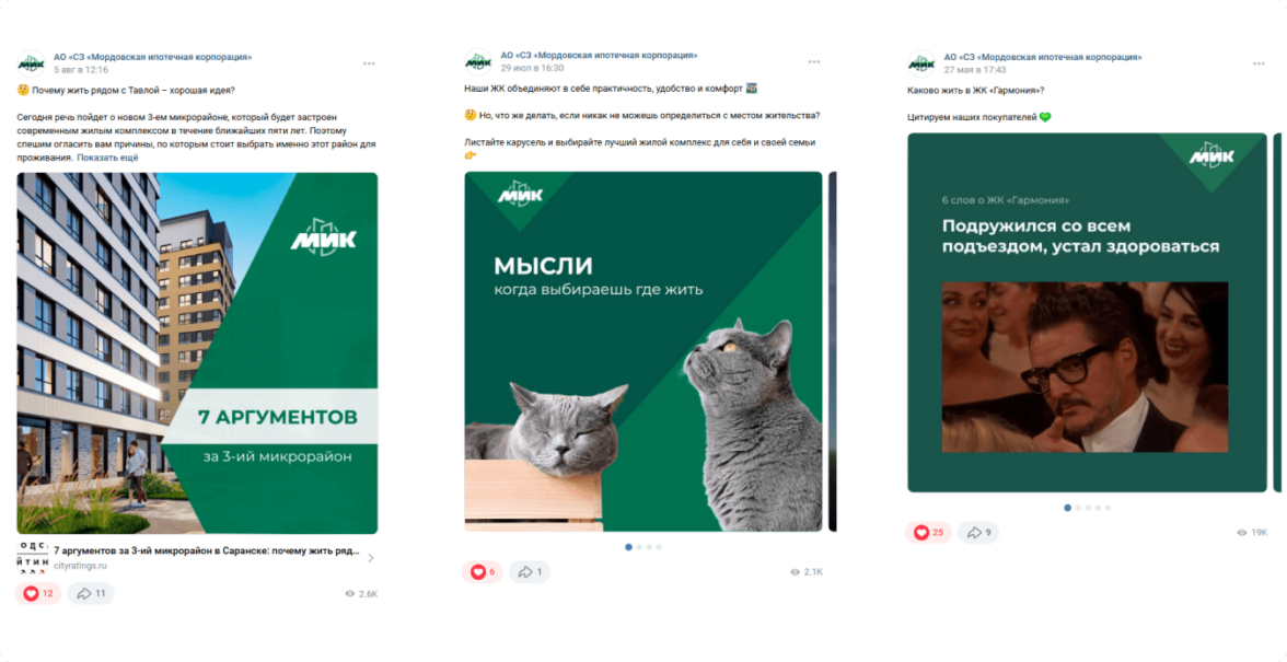 Лента ВКонтакте включает рубрики, характерные для данной ниши: новости в сфере недвижимости, акции, информационные посты о состоянии домов и квартир, и так далее.