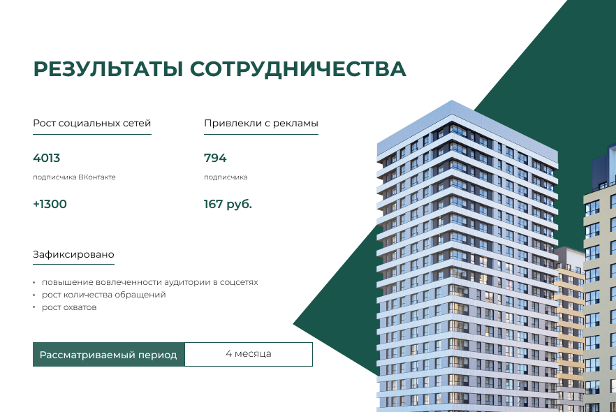 С помощью таргетированной рекламы мы можем как искать людей, заинтересованных в покупке новой квартиры, так и выстраивать комьюнити вокруг компании.