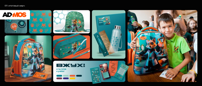 Для визуализации использовали Recraft, Lexica, Freepik AI и другие инструменты, чтобы найти подходящий стиль и окружение для персонажа. Финальный образ доработали в генеративном Photoshop, адаптировав его под интересы целевой аудитории. На основе Key Visual мы создали коллекцию школьного мерча, дополнив её тематической графикой.
