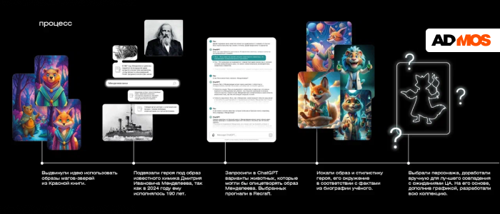 В прошлом году помощником в учёбе стал кибер-зайчик, а в этом мы обратились к теме краснокнижных животных. География СИБУРа охватывает регионы обитания редких видов, что позволило нам связать дизайн с экологическими ценностями компании. Мы использовали GPT для создания образов животных, наделив их магическими способностями, чтобы подчеркнуть связь учёбы с волшебством. А ещё — получили от команды СИБУРа отличную подсказку — добавить в образ маскота черты Дмитрия Менделеева, чьё 190-летие отмечалось в 2024 году. Химия, как и магия, стала ключевой метафорой. Мы изучили биографию учёного и с помощью ChatGPT подобрали животных, которые могли бы олицетворять его образ.