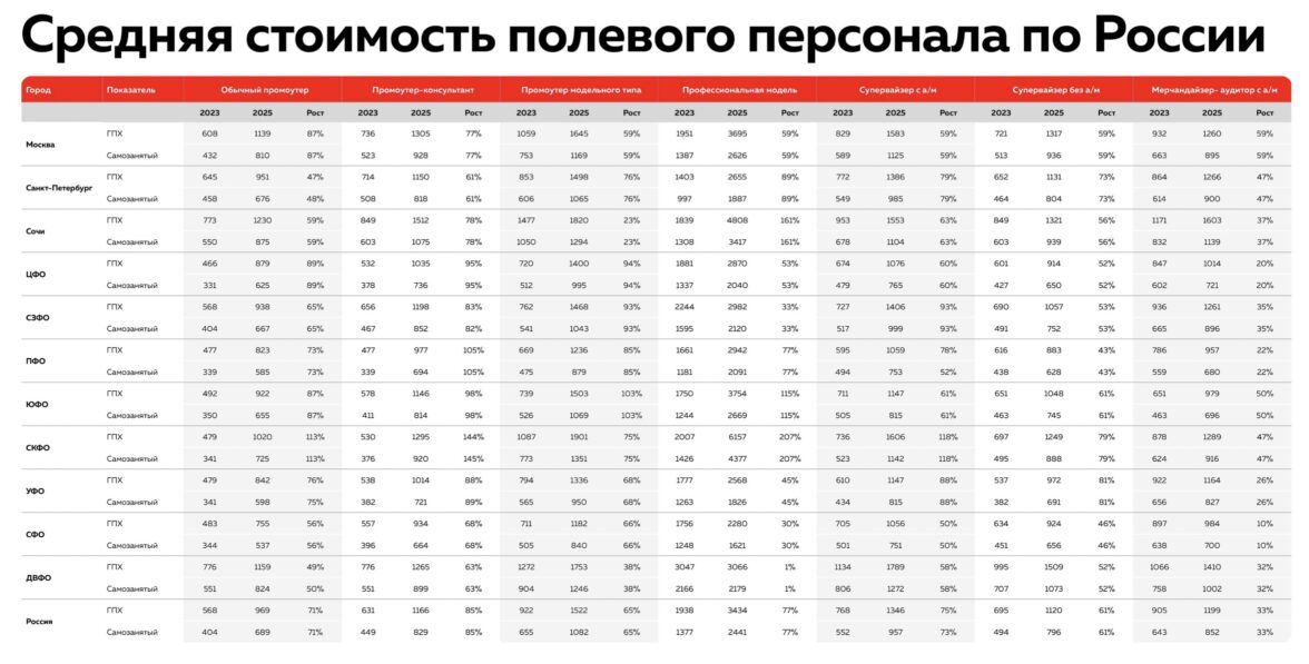 При этом в некоторых регионах динамика была значительно скромнее. Например, на Дальнем Востоке стоимость работы профессиональной модели практически не изменилась (+1% до 3 тыс. рублей), а позиции мерчандайзеров даже продемонстрировали небольшое снижение ставок.