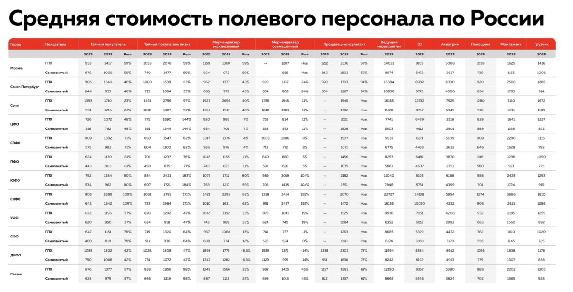Стоимость визита тайного покупателя увеличилась на 98% до 1,86 тыс. рублей, а часовая ставка промоутера-консультанта — на 85% до 1,2 тыс. рублей. Стоимость услуг профессиональной модели достигла 3,4 тыс. рублей в час (+77%). Почасовая оплата работы супервайзера с автомобилем составила 1,3 тыс. рублей в час (+73%), а обычного промоутера — 969 рублей (+71%).