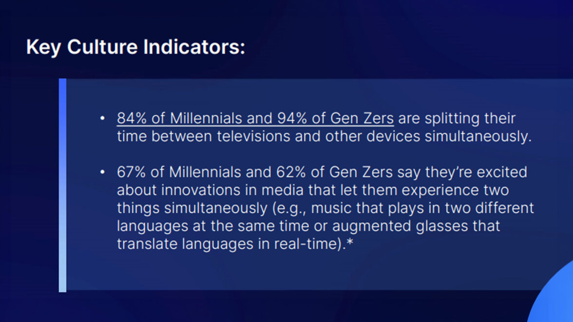 Более 84% миллениалов и 94% зумеров одновременно смотрят ТВ, листают соцсети и читают сайты. Это приводит к смешению форматов и требует от брендов создания комплексных, перекрёстных коммуникаций.
