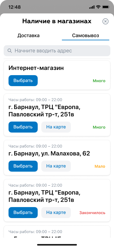 выбирать конкретный город и магазин и проверять там наличие необходимого товара;