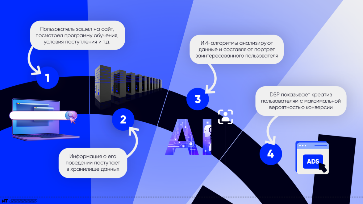 Чтобы быстро увеличить конверсии и снизить стоимость заявки, нужно очень хорошо знать целевую аудиторию, потребности каждого потенциального абитуриента, вовремя показывать ему креатив и исключить нецелевые показы. Для решения этой задачи «со звездочкой» NT DSP обучали на микроконверсиях. В упрощенном виде это выглядит так: