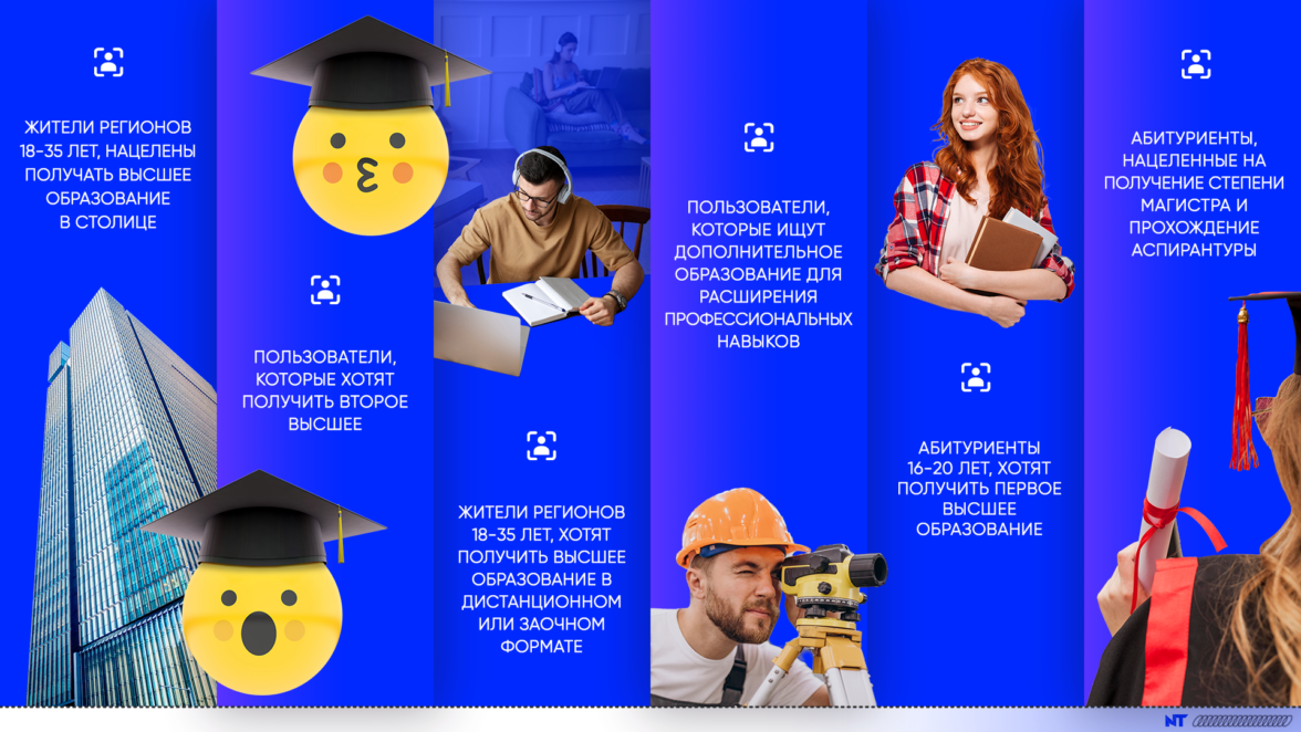 У высшего и дополнительного образования своя аудитория. Поэтому прежде всего команда NT проанализировала целевых пользователей и разбила их на более мелкие группы. Так, отдельно выделяли абитуриентов в поиске первого высшего образования, жителей регионов и не только.