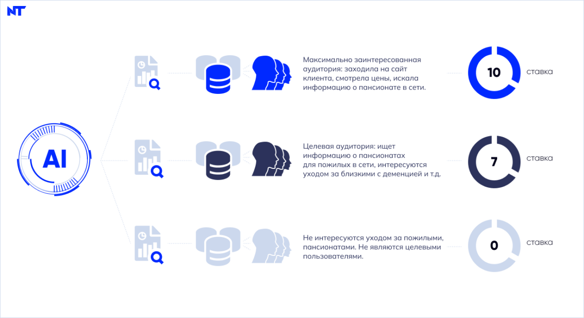 Рекламные кампании оптимизировали не только вручную, но и автоматически. NT DSP в режиме реального времени анализировала данные по каждому рекламному показу и автоматически корректировала коэффициент ставок с учетом ценности показа определенному пользователю — креативы показывались максимально заинтересованным пользователям по оптимальной цене.
