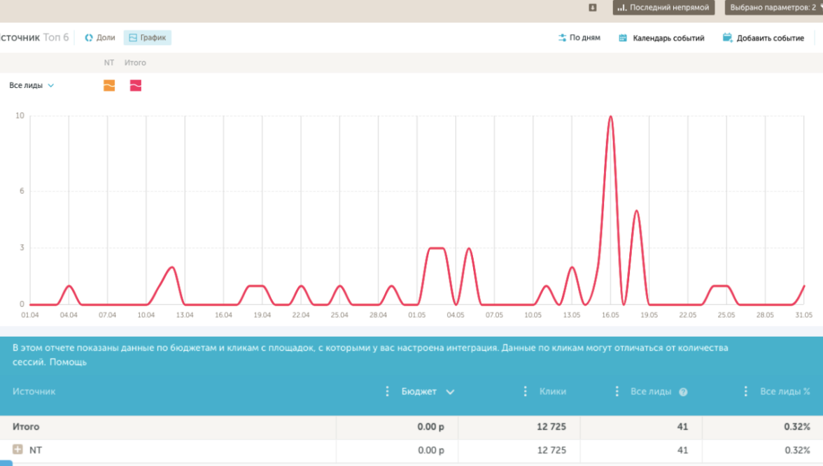 Канал показал хорошие результаты, поэтому часть бюджета мы перераспределили на него. На графике вы можете видеть распределение целевых лидов из тизерок.