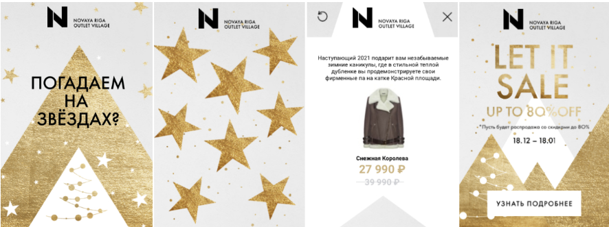 Пример: Получите прогноз на год вперед – от Vnukovo и Novaya Riga Outlet Village. Эта рекламная кампания была посвящена анонсированию зимней распродажи во Vnukovo Outlet Village и Novaya Riga Outlet Village. Так как распродажа стартовала перед Новым годом, в рекламных креативах (отдельных для двух аутлетов) сделали акцент на предстоящей смене года и решили включить интерактивный элемент – предложить пользователю получить предсказание на новый год.