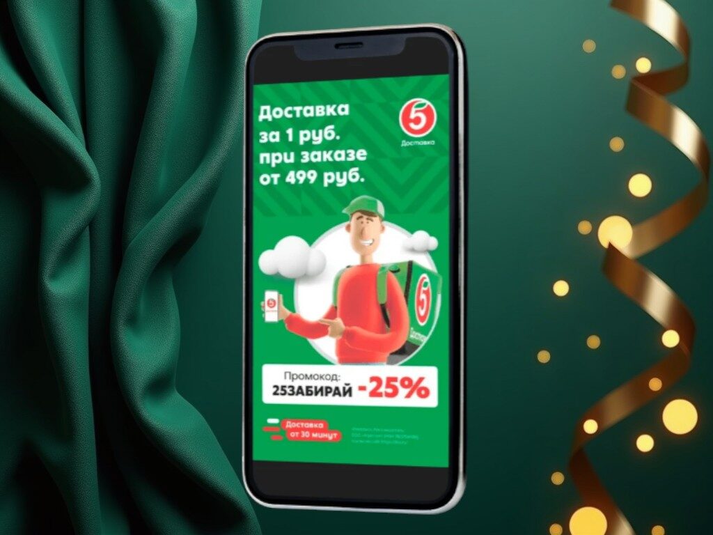 Пример: кейс MOBIDRIVEN для сети «Пятёрочка» в формате полноэкранной in‑app‑рекламы: информирование аудитории о промо-акции, стимулирование установок приложения клиента.