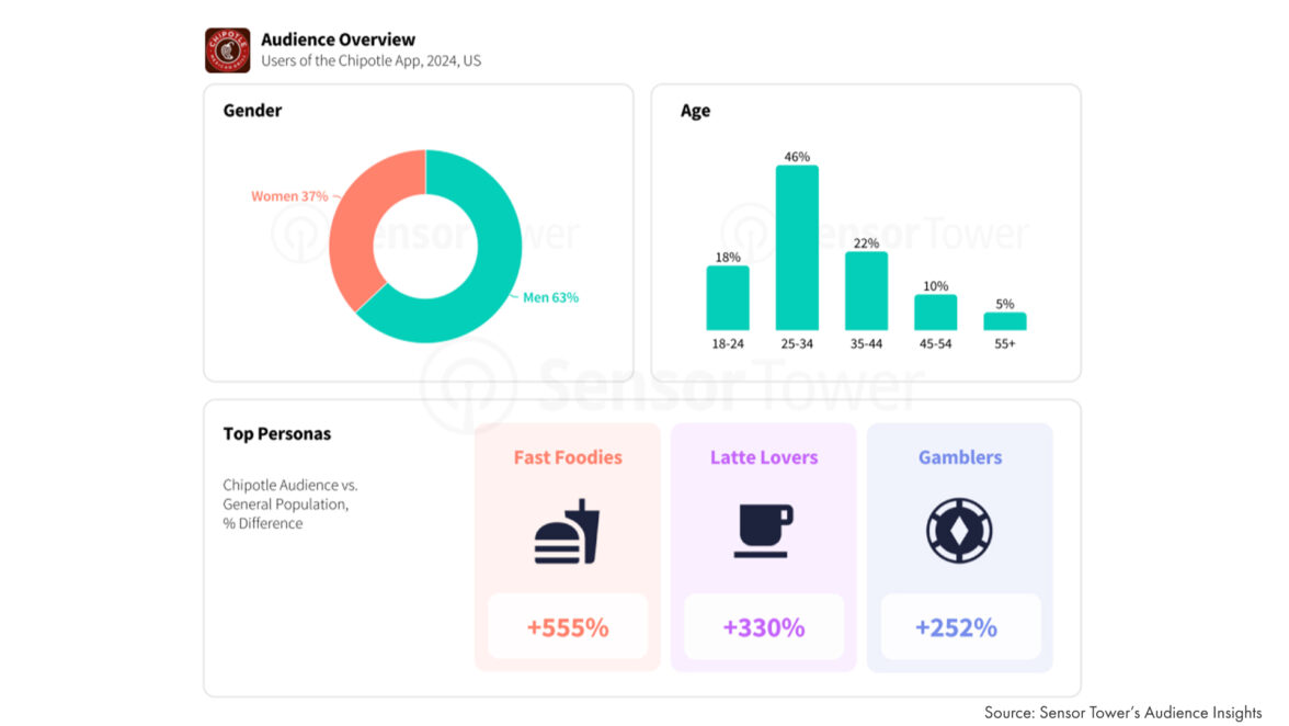 Если у бренда есть собственное мобильное приложение, аналитика по его аудитории становится ценным ресурсом. Примером может служить анализ приложения Chipotle: выяснилось, что 63% пользователей — мужчины, а наиболее активная группа — 25–34 года. Самыми вовлечёнными оказались те, кто интересуется быстрым питанием, кофе и игровыми развлечениями.