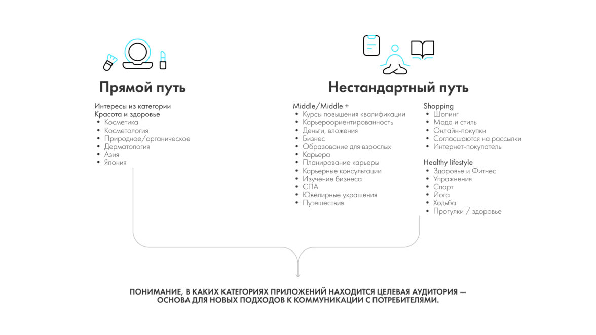 Ни одна из этих категорий напрямую не связана с бьюти-сегментом, однако именно такие данные помогают находить новые пути построения коммуникации и расширять аудиторию.