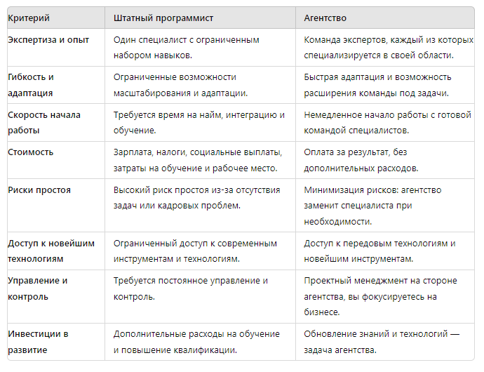 Если же вы готовы управлять процессом, а проект требует менее широкого набора навыков — штатный программист может оказаться подходящим вариантом.