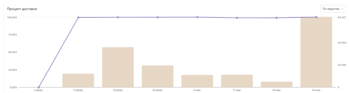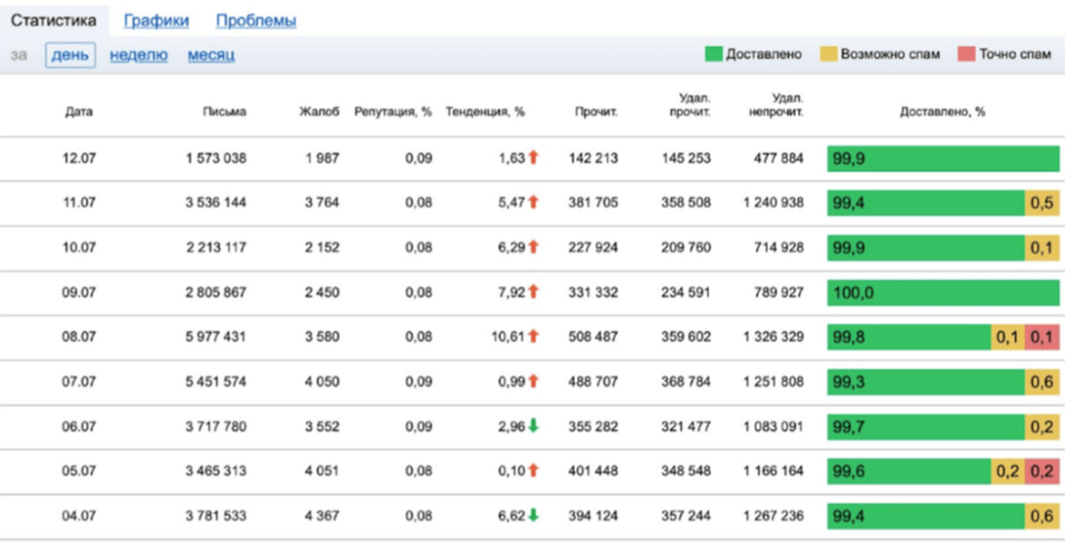 Например, после прогрева нового домена процент доставляемости рассылки составлял практически 100% (от 98,81% до 99, 89%, при норме до 98%). В нашем случае высокий процент был обусловлен ещё и спецификой базы (лояльные подписчики).