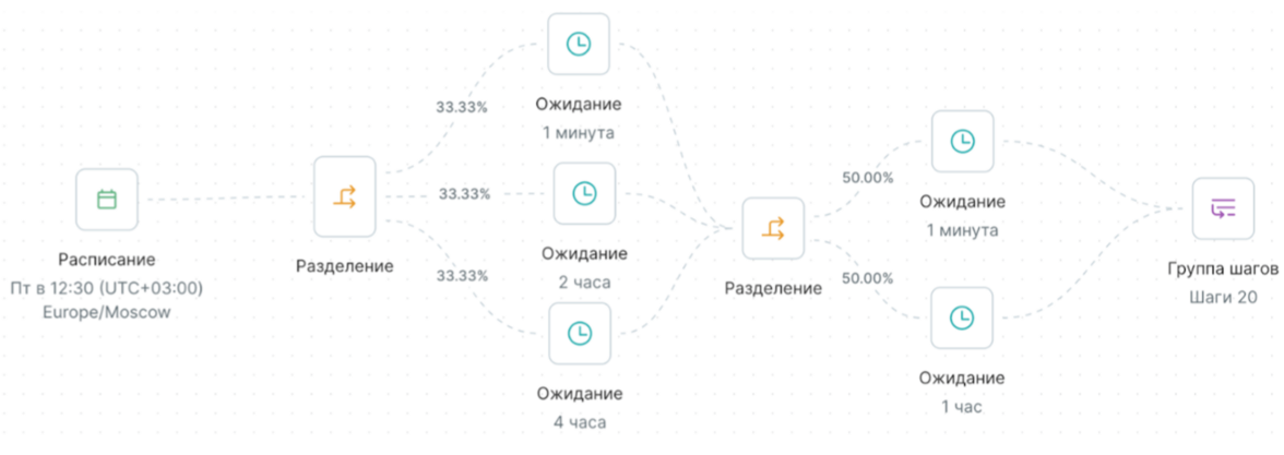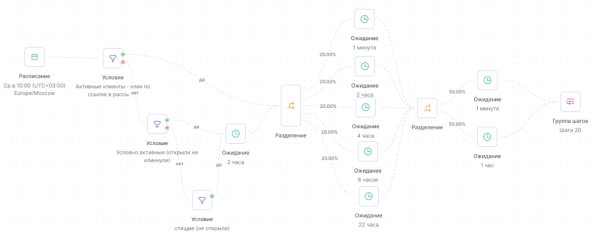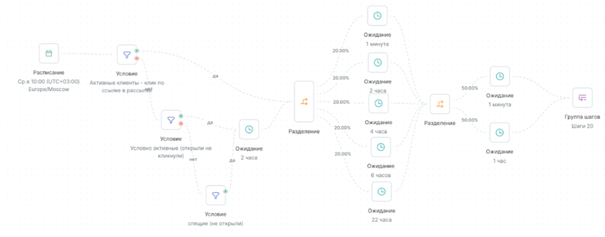 Схема делит базу в нужных пропорциях в произвольном формате с разным часовым лагом и отправляет рассылку.