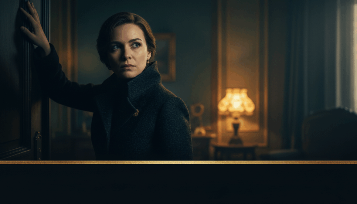 [ФОТО]. Промопостер драматического сериала. Героиня в полутемном интерьере, лицо освещено наполовину. Скрещенные руки или рука на дверной раме. Взгляд исподлобья. Темный костюм или пальто с поднятым воротником. Фон: размытый интерьер с теплым светом лампы. Глубокие темные тона с золотым акцентом. Внизу — пространство для названия. Не добавлять: яркие цвета, дневной свет, улыбку.