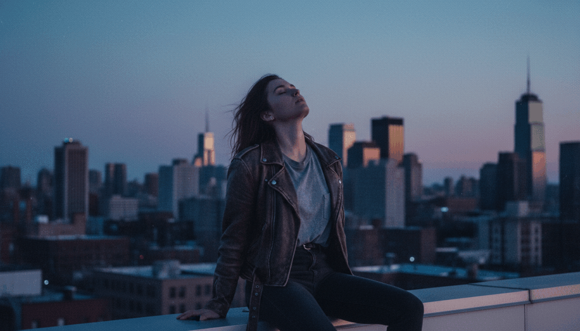 [ФОТО]. Обложка инди-альбома. Героиня сидит на крыше здания, фон — силуэты города в сумерках. Поза расслабленная, голова откинута, глаза закрыты. Ветер в волосах. Куртка из денима или косуха поверх простой футболки. Освещение Blue Hour, сиреневое небо. Зерно пленки, приглушенные холодные цвета. Квадратный формат. Не добавлять: студийный свет, яркие цвета, улыбку, текст.