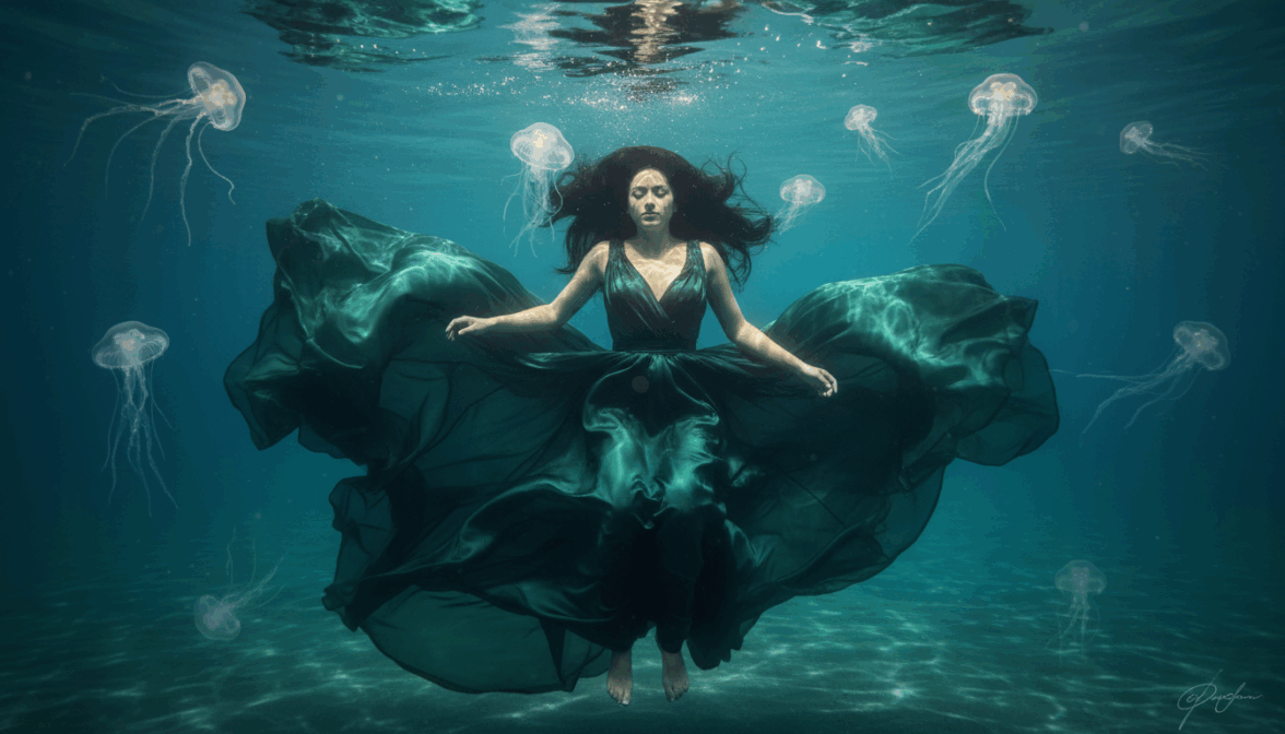 [ФОТО]. Подводный портрет. Героиня плавно опускается в глубину, глаза закрыты, выражение безмятежное. Волосы развеваются в воде. Длинное платье темно-изумрудного шелка расходится облаком. Вокруг полупрозрачные медузы. Сверху пробиваются косые лучи солнца, каустики на коже. Цвета: бирюзовый, изумрудный, серебристые блики. Не добавлять: бассейн, кислотные цвета, агрессивных морских обитателей.