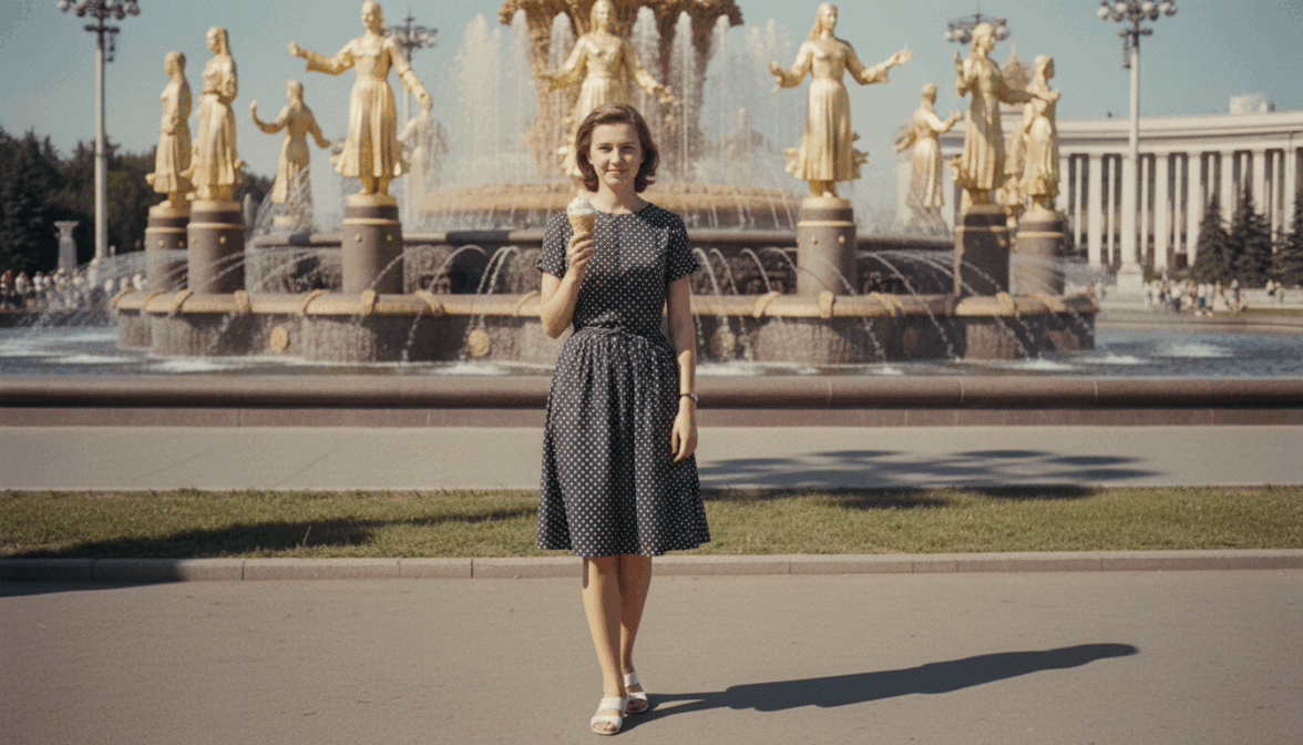 [ФОТО]. Советская пленочная фотография 1960-х. Героиня у фонтана «Дружба народов» на ВДНХ, в руке вафельный стаканчик мороженого. Легкая улыбка, прищур от солнца. Приталенное платье в горошек, белые босоножки. Яркий дневной свет, жесткие тени. Цвета слегка выцветшие, теплый сдвиг, зерно пленки 35 мм. Не добавлять: современные логотипы, смартфоны, темную палитру.