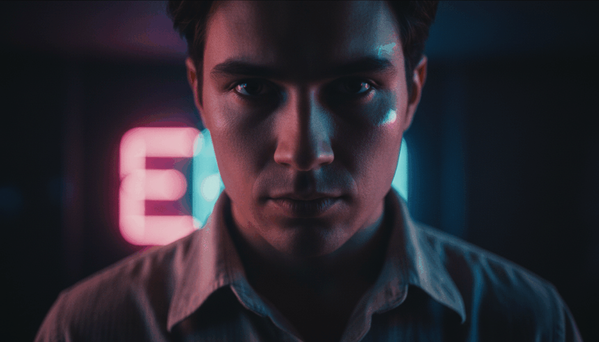 [ФОТО]. Портрет крупным планом в стиле студии A24. Взгляд прямо в камеру, уязвимость и сила. Кожа без ретуши, видны поры. Блик неона на щеке. Мятая винтажная рубашка. Темный фон с размытыми огнями розового и голубого неона. Смешанное освещение, легкая зернистость. Глубокие тени, контрастные цвета. Не добавлять: гламурный макияж, идеальную кожу, белый фон.