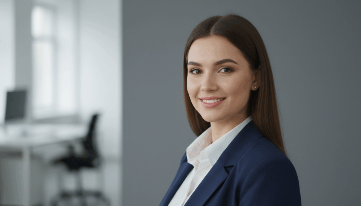 [ФОТО]. Деловой портрет по грудь. Разворот на три четверти, лицо к камере, уверенная доброжелательная улыбка. Темно-синий блейзер, белая рубашка. Натуральный макияж. Фон: мягко размытый светлый офисный интерьер или однотонный серый. Мягкое студийное освещение, блик в глазах. Не добавлять: темный фон, драматичные тени, повседневную одежду, активные жесты.