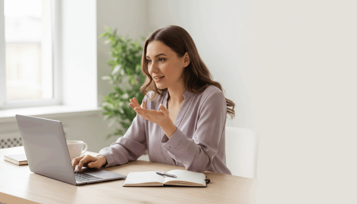 [ФОТО]. Обложка онлайн-курса, формат 16:9. Героиня за столом с ноутбуком, рядом блокнот и кофе. Одна рука на клавиатуре, другая жестикулирует. Вовлеченное выражение, легкая улыбка. Рубашка или блуза мягкого оттенка. Фон: светлое рабочее пространство с растением, размытое. Мягкий дневной свет. Справа — пространство для заголовка. Не добавлять: темный фон, экран ноутбука в фокусе, студийные эффекты.