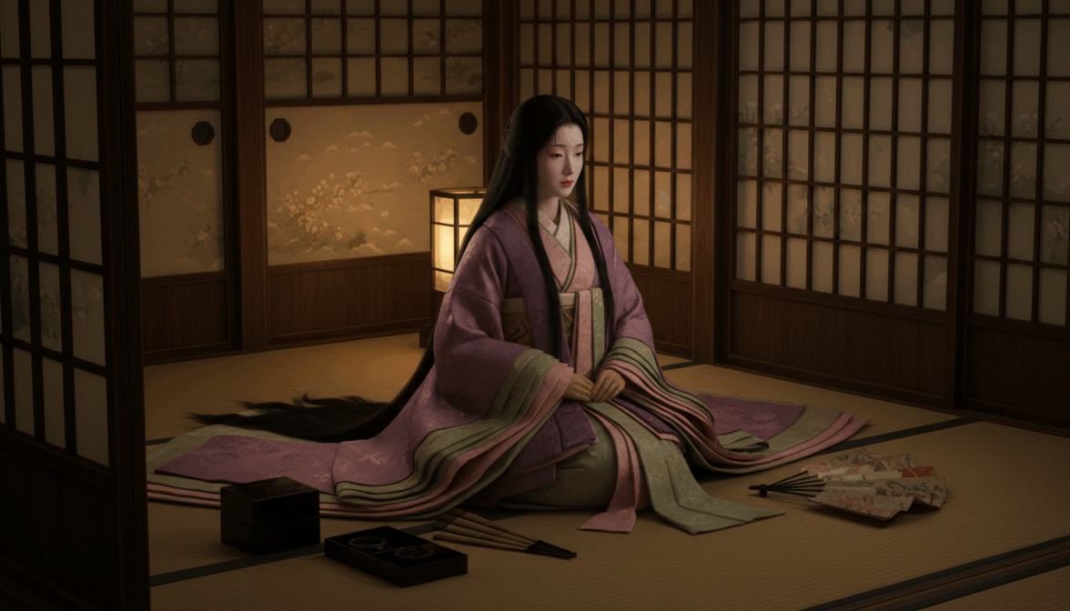 [ФОТО]. Придворная дама эпохи Хэйан, Япония X века. Сидит на татами в полутемной комнате с ширмами. Многослойное кимоно: сливовый, бледно-розовый, цвет зеленого чая. Длинные черные волосы лежат на полу. Лицо с рисовой пудрой, губы тронуты алым. Рядом веер и тушечница. Мягкий свечной свет. Приглушенные благородные тона. Не добавлять: яркий свет, современные предметы, аниме-стилизацию.