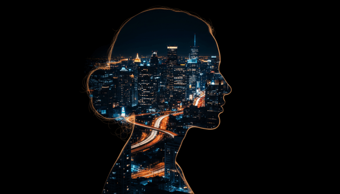 Силуэт заполнен огнями мегаполиса — два мира в одном кадре.