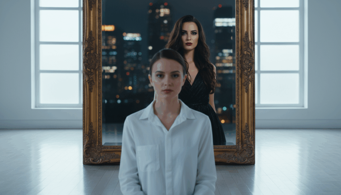 [ФОТО]. Концептуальное фото: героиня перед большим старинным зеркалом в золотой раме. В реальности — спокойная, белая рубашка, волосы собраны, нейтральное лицо. В отражении — волосы распущены, яркий макияж, дерзкая усмешка, черное вечернее платье. Свет реальности холодный и мягкий, в отражении — теплый и контрастный. Фон реальности светлый, в зеркале — темный с огнями. Не добавлять: разбитое зеркало, мистических существ.