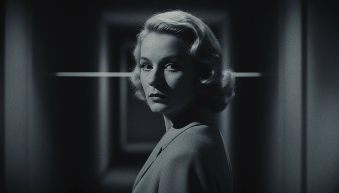 [ФОТО]. Крупный портрет в стиле фильмов Хичкока. Героиня оборачивается через плечо, взгляд настороженный. Светлые волосы уложены в холодную волну. Строгий жакет пастельного оттенка. Жесткое боковое освещение, глубокие тени на половине лица. Фон — темный коридор с полоской света. Палитра приглушенная: серо-голубые и бежевые тона. Зернистость пленки. Не добавлять: яркие цвета, улыбку, современную одежду.