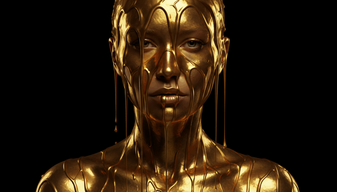 [ФОТО]. Арт-портрет: по лицу, шее и плечам стекает жидкое расплавленное золото — густое, с реалистичными бликами. Частично покрывает кожу, застывая волнами, остальная кожа чистая. Взгляд прямой, спокойный. Фон матово-черный. Контрастное освещение с двух сторон. Цвета: золотой и черный. Макродетализация золотых потоков. Не добавлять: одежду, украшения, пестрый фон, мультяшность.