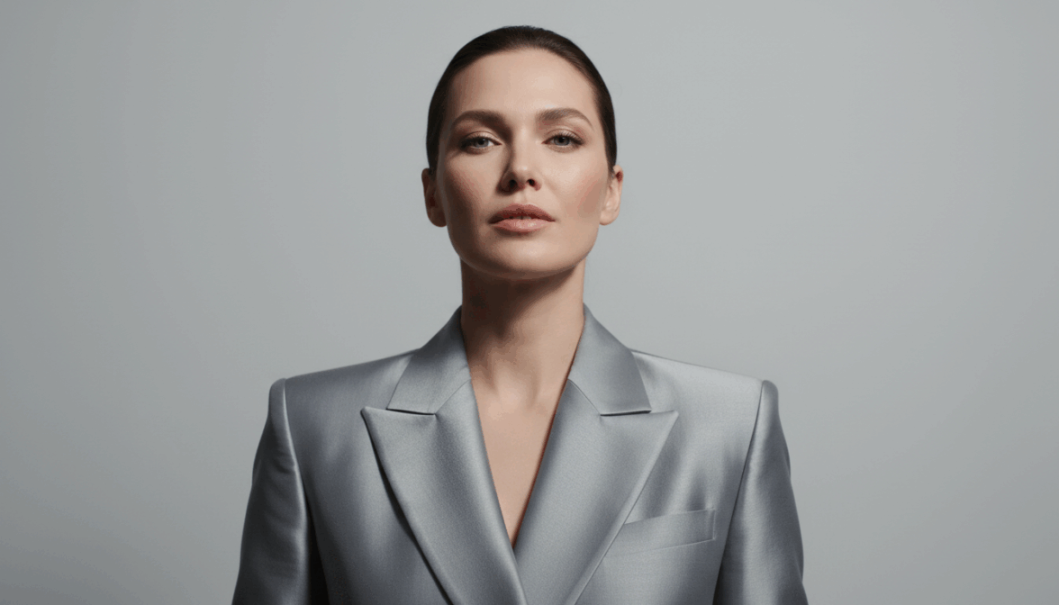 [ФОТО]. Обложка Vogue. Портрет по грудь, взгляд прямо в камеру, уверенное спокойное выражение. Утонченный макияж, подчеркнутые скулы. Элегантный блейзер архитектурного кроя, текстура шелка или атласа. Студийное освещение Butterfly Lighting. Фон однотонный: белый или серый. Высочайшая детализация. Вверху кадра — пространство для логотипа. Не добавлять: текст, логотипы, неоновый свет, уличный фон.