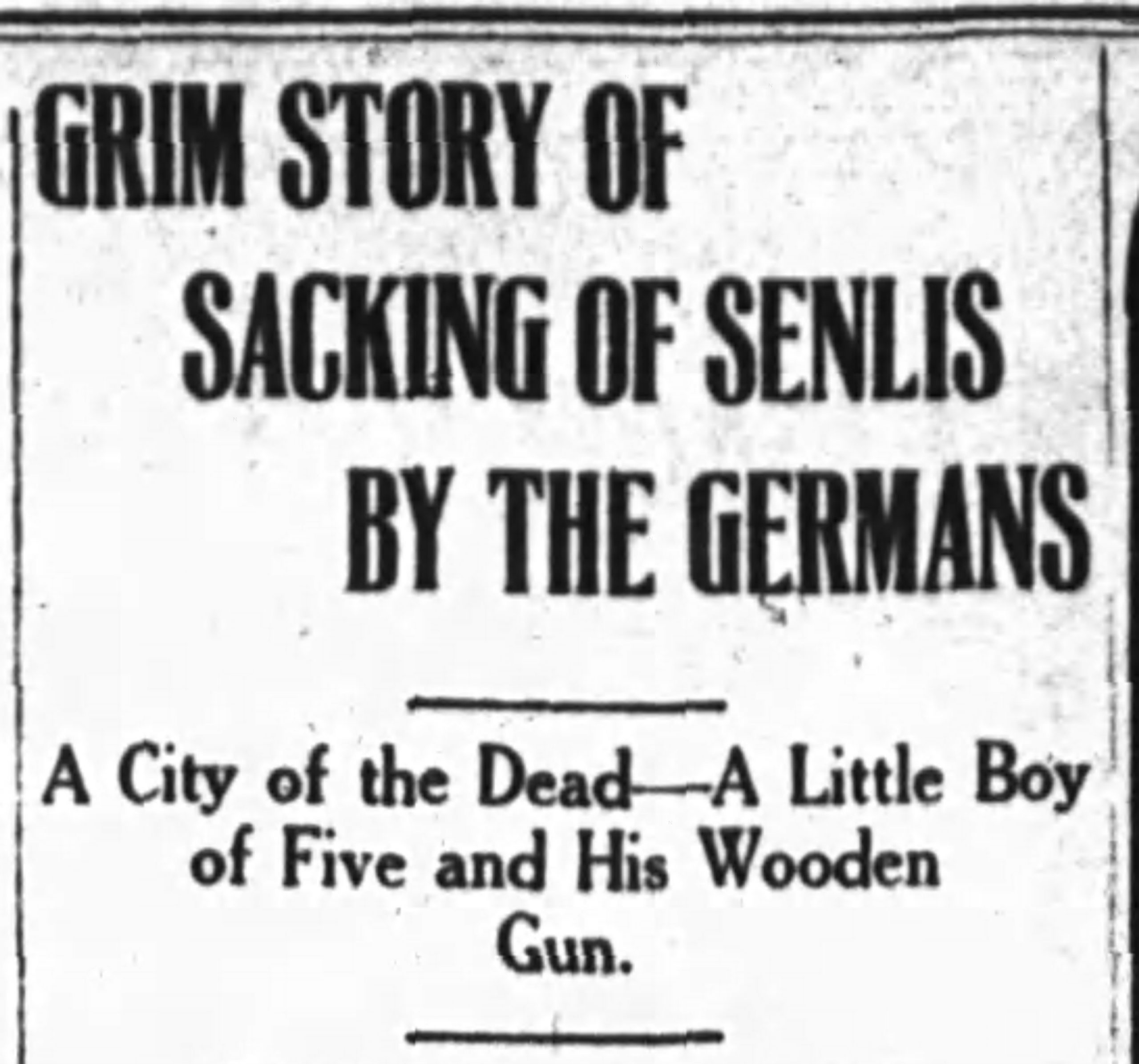 Прошло всего два месяца с начала Первой мировой, когда весь мир облетело сообщение корреспондента лондонской The Times во Франции от 25 сентября 1914 года. Журналист рассказывал о разграблении города Санлис отступающими германскими войсками: